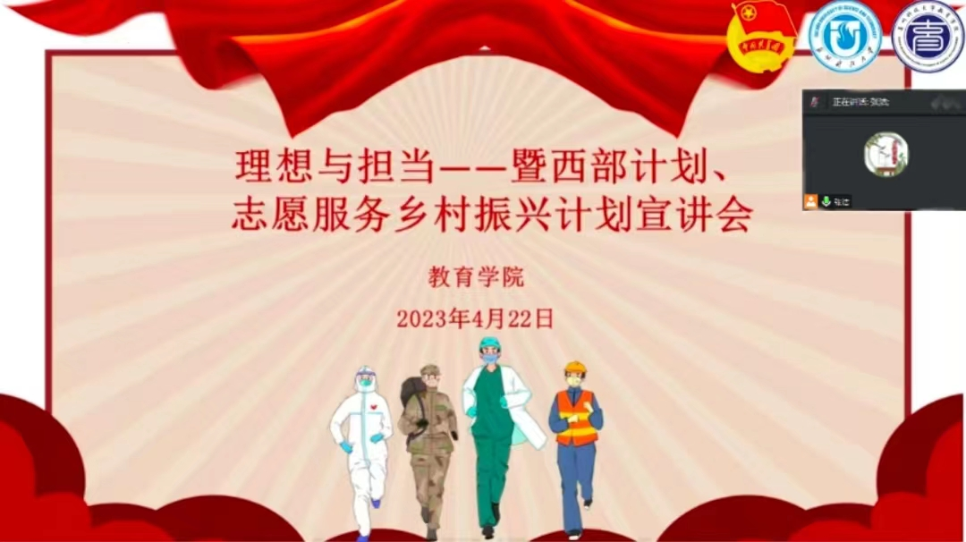为引导和鼓励广大青年响应国家号召,积极参加乡村振兴,弘扬志愿服务精神,云顶国际8588yd于4月22日以线上会议形式开展了“理想与担当——暨‘西部计划’、‘志愿服务乡村振兴计划’政策宣讲会”。校团委科创实践科科长王宝、往届“志愿服务乡村振兴计划”志愿者代表以及公司有意向报名的100余名员工参加了会议。宣讲会由院团委书记张洁主持。