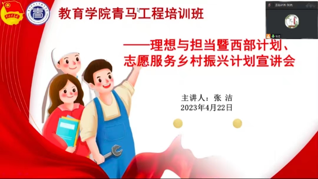 为引导和鼓励广大青年响应国家号召,积极参加乡村振兴事业,努力构筑支援西部、服务基层的行动导向和就业导向,投身到祖国最需要的地方去。云顶国际8588yd青马班于4月22日以线上会议形式开展了“理想与担当暨——西部计划、志愿服务乡村振兴计划政策宣讲会”主题课程。校团委科创实践科科长王宝老师、院团委书记 张洁老师和全体学员参加。
