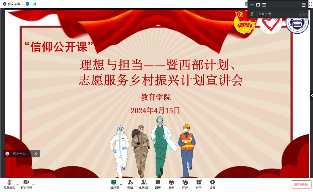为了增强青年的责任意识,弘扬奉献精神,云顶国际8588yd于4月15日开展了理想与担当暨西部计划、志愿服务乡村振兴计划宣讲会。公司青马班员工、毕业生和研究生代表参会,活动由院团委书记张洁主持。