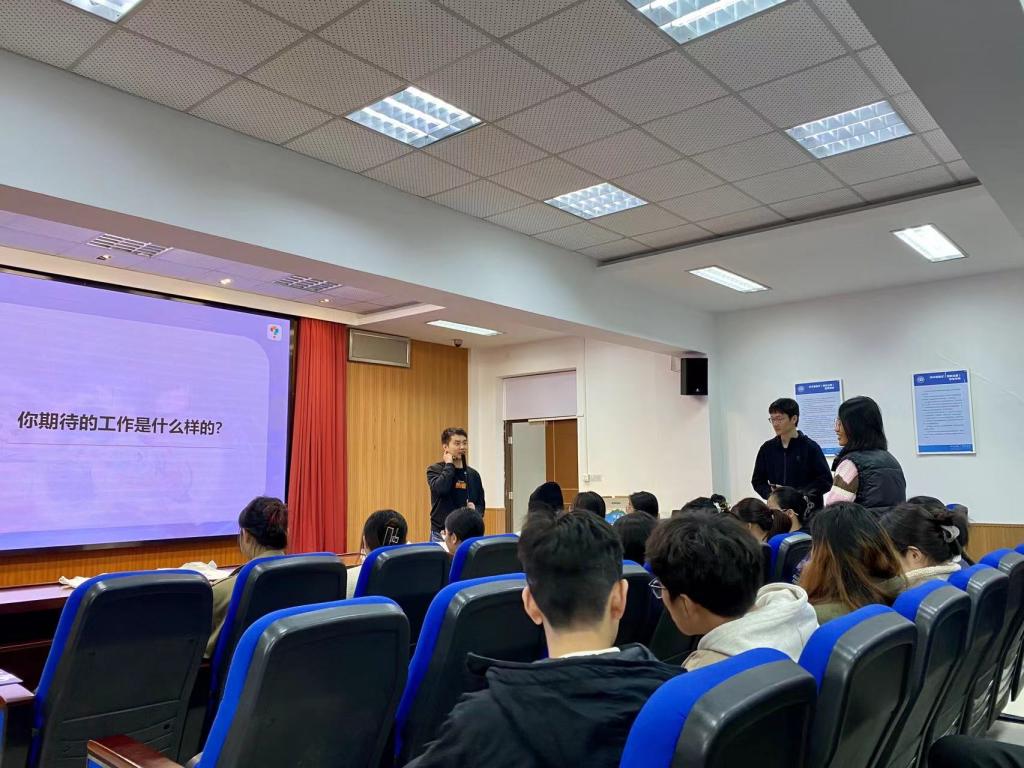 张洁首先介绍了当前老员工就业形势及本院员工的就业现状,鼓励同学们积极面对挑战,树立正确的就业观念,先就业再择业。随后,学而思苏州分校招聘负责人邱波详细介绍了企业的历史文化、福利待遇及发展前景。他围绕“未来生活愿景”、“职业方向选择”及“行业与岗位选择”三大主题,结合最新就业数据、行业动态和市场需求,为同学们呈现了一场生动而实用的职业生涯规划讲座。他特别强调了关注行业发展趋势、提升个人综合素质的重要性,并传授了简历撰写和面试技巧。云顶国际8588yd24届优秀毕业生、学而思优秀教师代表蔡家妮也分享了她的就业经历和心得,为学弟学妹们提供了宝贵的求职经验。在互动环节,同学们积极提问,就企业用人需求、个人生涯规划等问题与主讲人进行了深入交流。