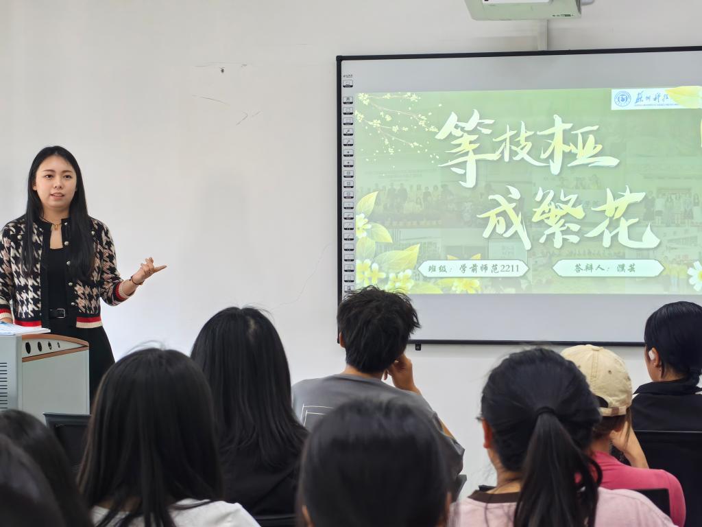 会上,张老师详细解读了先进班集体的创建标准,强调要以“思想引领为核心、学风建设为基础、特色活动为载体”,构建“班班有目标、人人有责任”的创建体系,推动班级建设提质增效。辅导员薛颖结合学前2211班的实践经验,以班级日志为范例,建议各班立足专业特色,创新活动形式,打造“有温度、有深度、有亮度”的班级文化品牌。濮芸从制度构建、学风营造、文化活动、成果凝练等方面分享了创建经验,并建议班委注重日常材料积累,做到“早谋划、早准备、早落实”,为评选打下坚实基础。