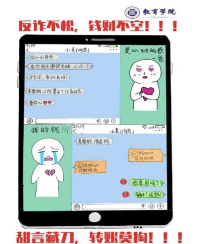 比赛过程中,同学们踊跃参与,涌现出一批创意鲜明、主题突出的海报作品。这些作品从多角度揭示诈骗手法,视觉表现各具特色。例如,学前F2211班李姝乐同学的作品《善恶骗具,慧眼识局》,聚焦“校园贷”陷阱,通过强化“骗”字的视觉吞噬感,结合诡异人脸与诱惑话语,深刻揭露诈骗背后的危害;心理2311班石春煽同学的作品《甜言背后的镰刀》,则巧妙模拟网恋诈骗聊天界面,以甜蜜对话与警示标语形成强烈反差,清晰呈现诈骗全过程,提醒同学们警惕情感诱饵。两件作品凭借深刻的立意与出色的视觉表达,荣获一等奖。