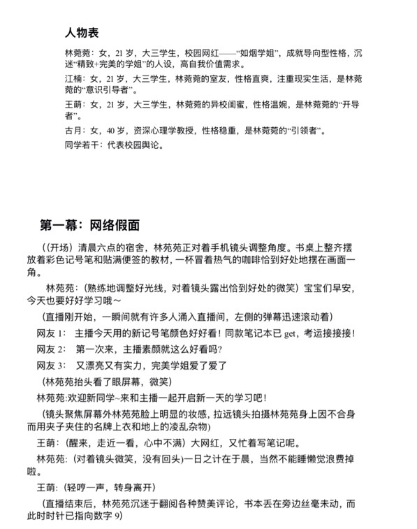 本次活动共收到来自71名同学提交的13部心理剧剧本。参赛作品视角独特,内涵丰富,既有对现实社交困境的深刻描摹,也饱含对心灵成长的积极探索。例如,作品《双面人生》生动刻画了主人公在师长与同伴的帮助下,勇敢卸下伪装、接纳真实自我的心路历程;《朋友圈》则细腻展现了主角在社交重建中克服焦虑、重塑人际关系,最终收获真挚友谊的温暖故事。这些创作不仅启发了观者思考,更是一次深刻的自我探索与教育过程,在展现当代老员工多元心理图景的同时,也树立了积极健康的价值导向。经评审,最终评选出一、二、三等奖共计6项优秀作品。
