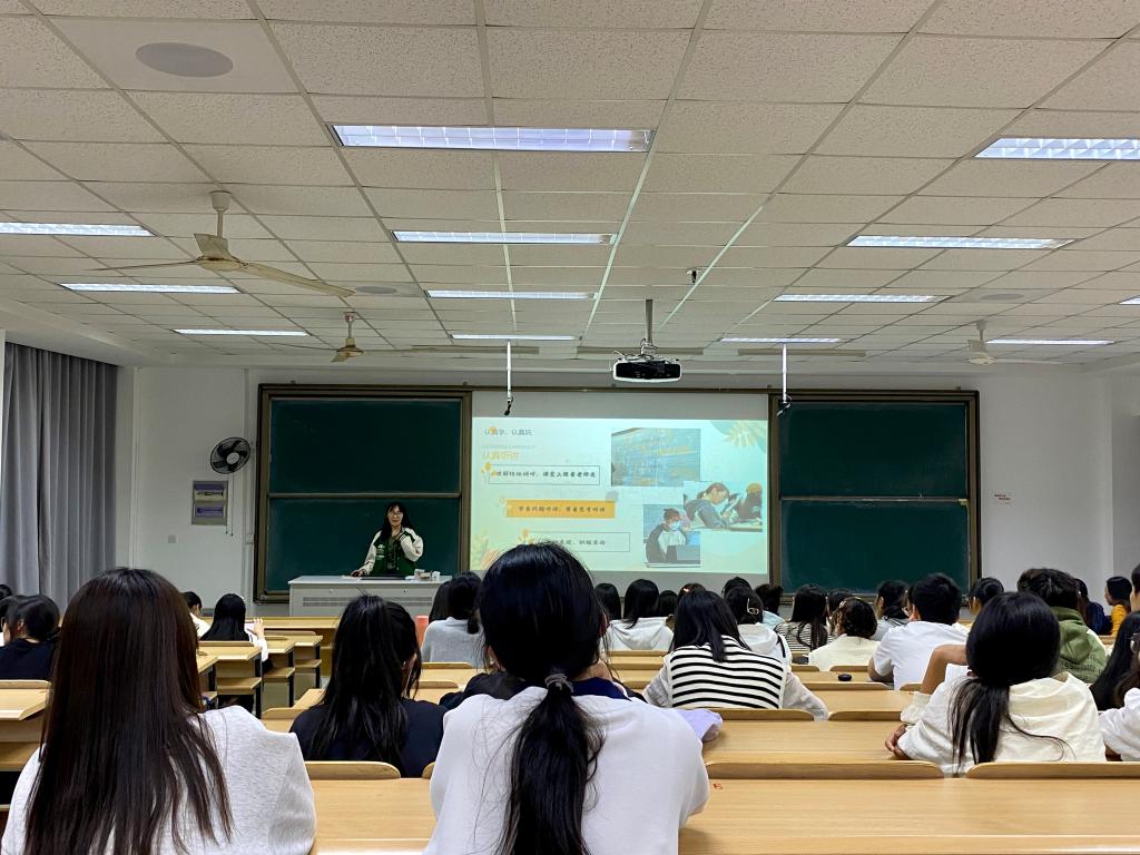 六名员工结合自己的经历,与新生分享了很多切实可行的学习方法。尹萌同学为大家剖析了大学四年的课程学习经验;黄锦慧、胡永珊同学从科研训练、课题研究、志愿服务等方面鼓励大家积极参加校内外科研实践活动;秦铭欣同学从大学的学习、工作、生活、就业等多方面建议大家合理安排时间,做到劳逸结合;濮芸同学分享了实用学习技巧,如根据“艾宾浩斯遗忘曲线”理论定时复习,巧用“舒特尔方格法”训练专注力;周颖同学提醒新生们要提前了解到各类考试考证的时间及准备方法,抓住课程中上台展示的机会来提升个人语言表达能力、增强自信心与自我认同感。在之后的互动交流过程中,6位同学就新生的提问进行了细致而耐心的解答。最后张老师勉励同学要以优秀学姐为榜样,在大学里做到:学会学习、学会生活、学会与人相处,争做优良学风建设的参与者、实践者和受益者。