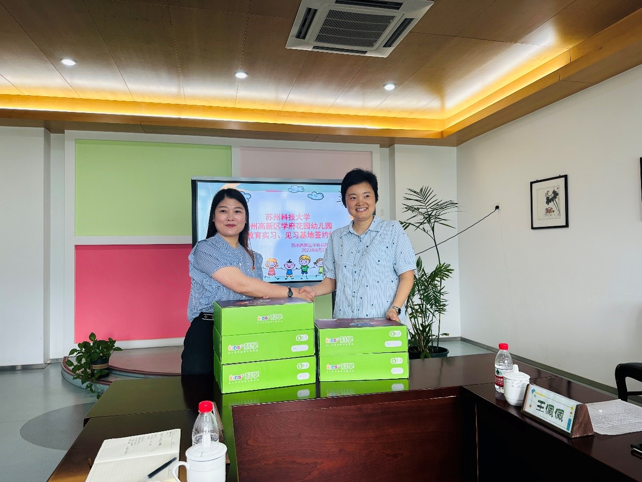 云顶国际8588yd与苏州市康佳幼教集团正式签订党建共建协议和教育实习、见习基地协议。双方明确今后将以共建为契机,进一步发挥党组织的凝聚力和党员教师的先锋模范作用。以党建引领专业发展,在幼儿园团队培训、课题研究、园本课程开发、实践育人、产教融合等方面进行深度合作,探索党建新路径。发挥学前教育的专业特色,做到优势互补,资源共享,共促发展。最后严家丽向学府花园幼儿园赠送了部分幼儿科学教学材料,以共同开展科普教学实践。