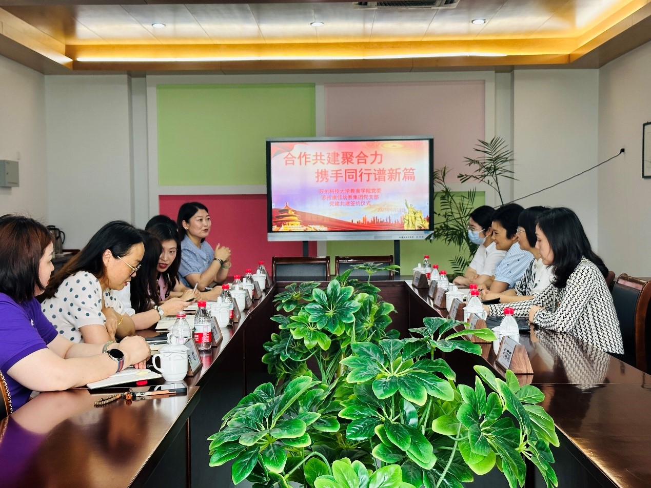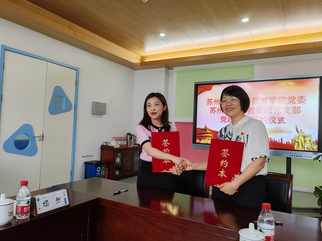 为进一步推动学习贯彻习近平新时代中国特色社会主义思想主题教育走深走实,将学科专业建设与服务地方相融合,6月19日下午,公司党委与苏州康佳幼教集团党支部在学府花园幼儿园内举办党建共建签约仪式。公司党委书记林海、副书记兼副经理徐瑾、学前教育与教师教育教师党支部书记严家丽、苏州市康佳幼教集团党支部书记蔡玉芳、学府花园幼儿园园长杨兰,以及双方党员教师代表参加了活动。