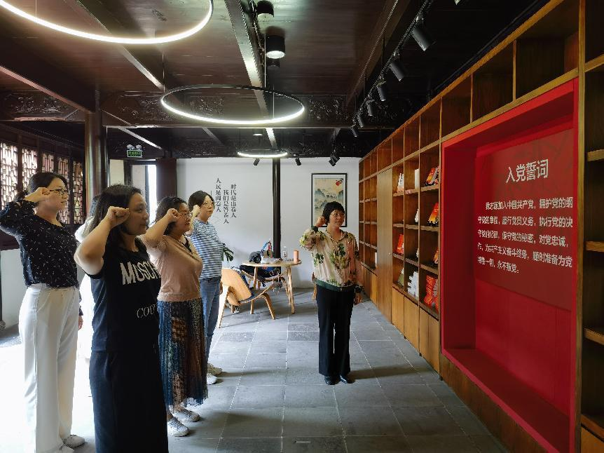 之后全体党员在这红色教育基地进行一次别开生面的主题教育学习。党总支书记林海带领党员们在南社通讯处旧址“黎花应春”党员活动中心重温入党誓词,真切感悟革命精神,汲取红色力量。党总支副书记兼副经理徐瑾为党员们展开一场深入人心的沉浸式党课---《从1919到1949》,并领学《习近平新时代中国特色社会主义思想学习纲要》选段,将中国共产党的百年光辉历程展现在党员们的眼前,让这场既有深度又有温度的主题教育走“新”更走“心”。