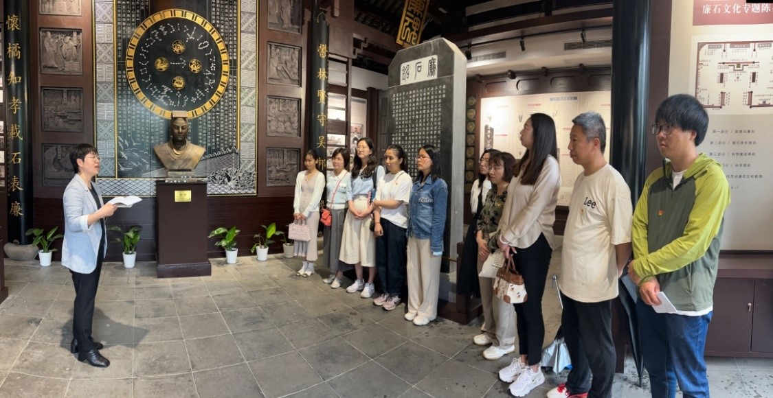 首先,大家一起参观了苏州文庙西苑廉政文化园。步入文庙庄严的大门, 孔子的雕像映入眼帘,让大家感受到了两千多年前,教育先行者留下的育人智慧和师德风尚。接着,在志愿者的带领下,大家学习了馆内珍藏的碑刻,包括“天文图”,“地理图”,“帝王绍运图”和“平江图”碑,简称为“天,地,人,城”四大宋碑。了解了厚重的中华文明历史,深刻领略了优秀的中华传统文化。之后,大家重点参观了廉石文化展示馆,详细了解了 “陆绩与廉石”“廉石故乡探访” “府学清官”的故事,学习了陆绩与廉石的历史,以及古代苏州府学与廉政相关的史料,体会了苏州当代廉石文化。