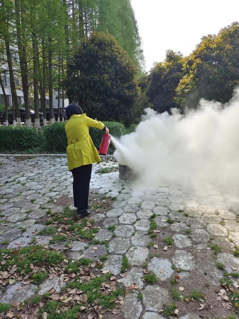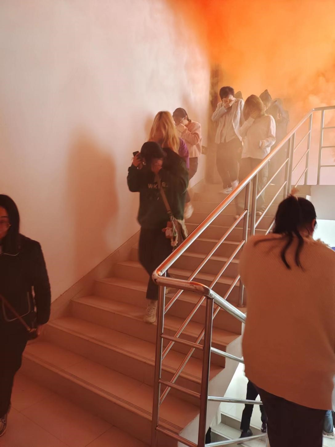 讲座结束后进行消防演练。随着消防烟幕弹浓烟喷出,师生代表们迅速进入演练状态。大家按照疏散预案,有序撤离教学楼,并在指定地点集合进行灭火器使用培训。卢致远现场演示了消防水枪和灭火器的使用方法,参与演练的全体人员亲身体验扑灭初级火情的过程。整个演练过程紧张而有序,达到了预期效果。
