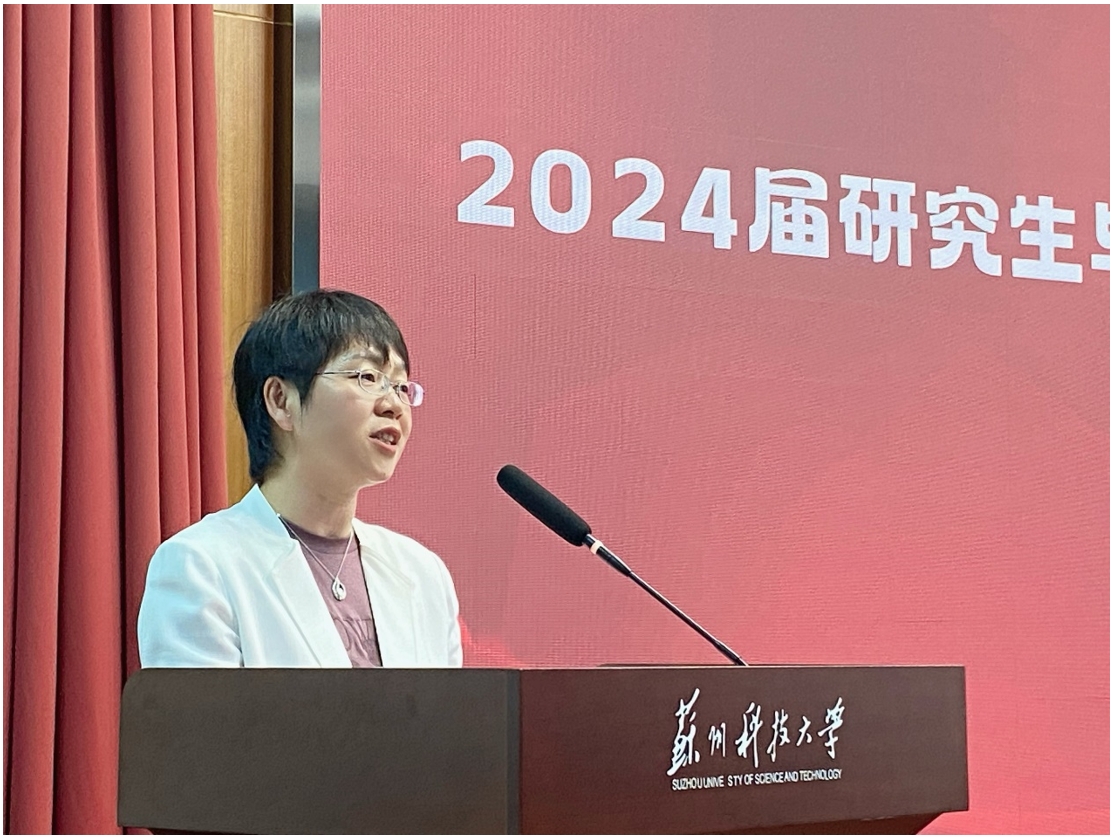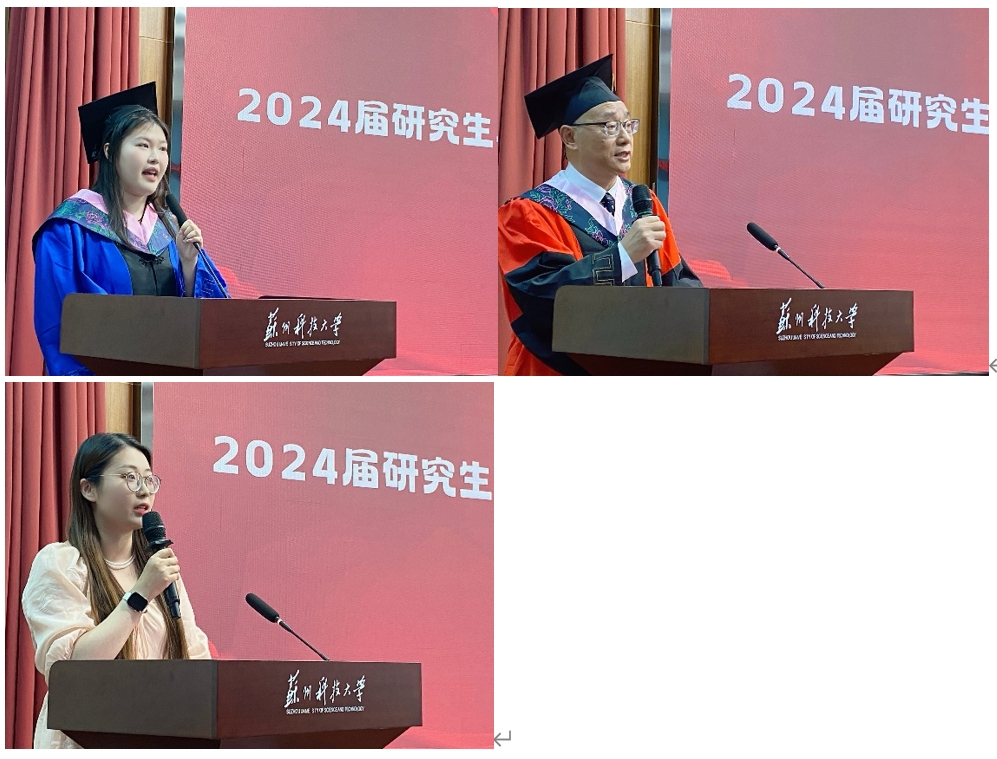 马苏兰同学代表全体研究生毕业生发言,韦洪涛教授代表全体硕士生导师为2024届全体毕业生送上真诚的祝福。吴江实验小学心理健康教师、2022届硕士研究生龚小霞作为代表员工分享经验。
