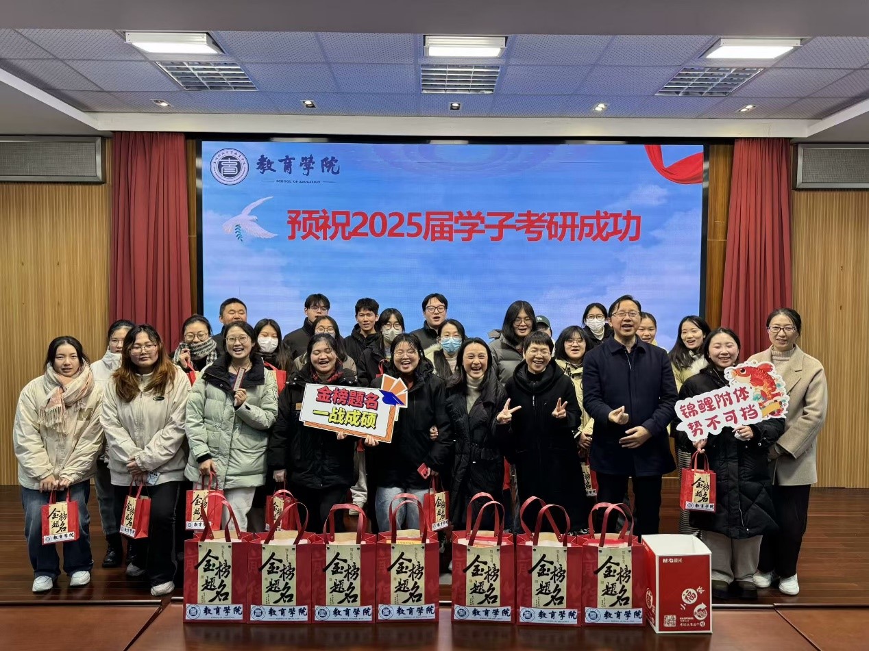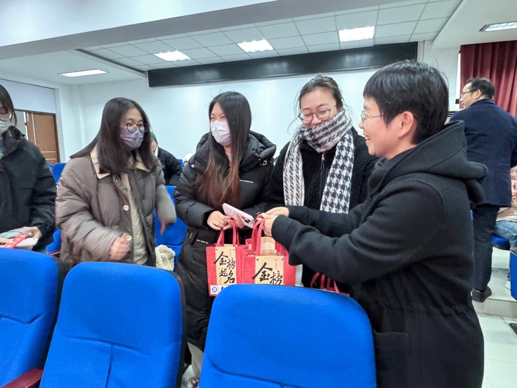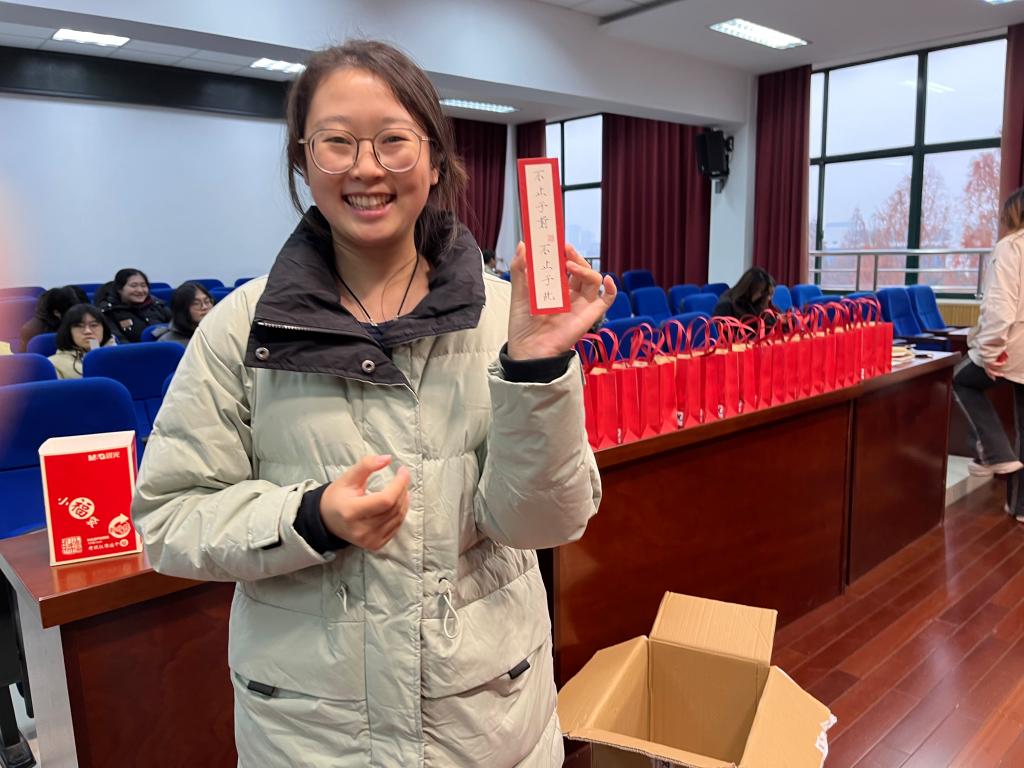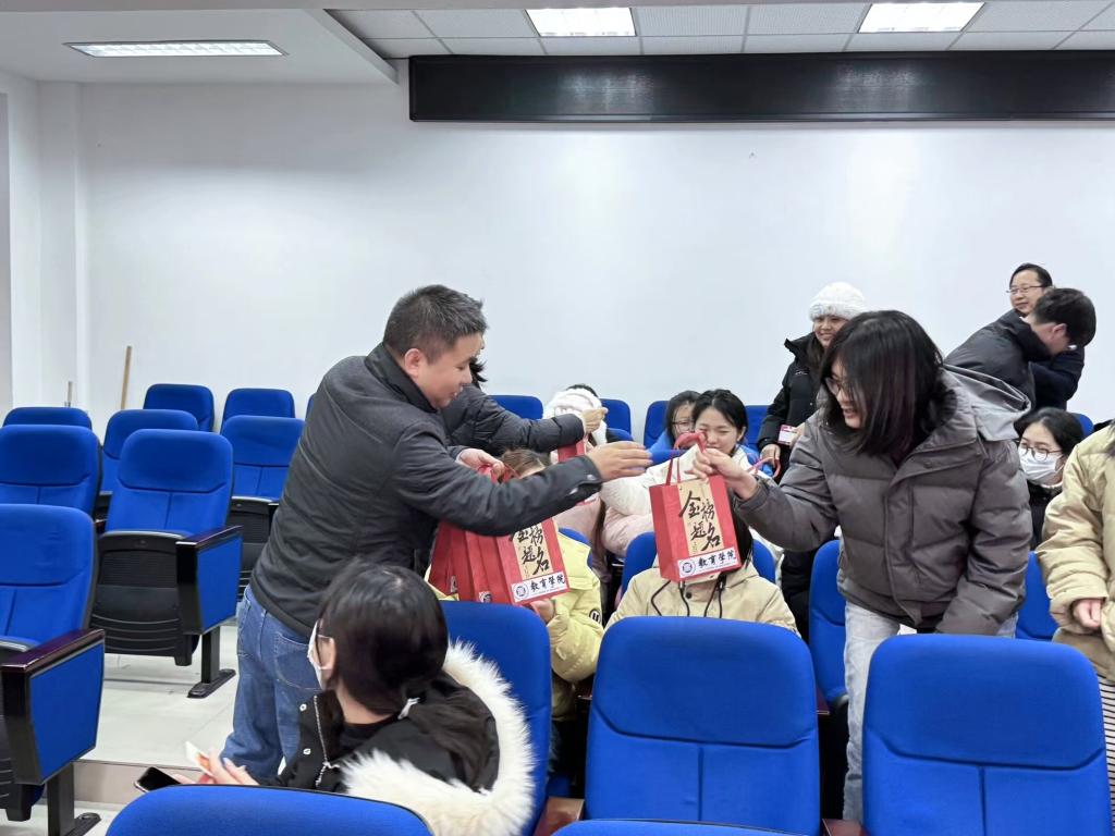 活动中,同学们现场抽取考研幸运签。党政领导为员工们发放了内含考研学习用品、美味的爱心餐点以及励志寄语的“考研爱心包”。