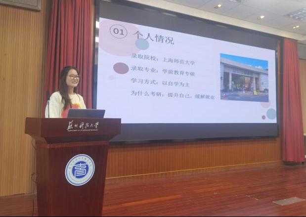 会议还邀请了三位2025届优秀员工代表分享经验。即将入职苏州维园幼儿园的秦语同学分享了求职经验,从面试技巧到职业规划,为同学们提供了实用的建议。考取上海师范大学的刘桢同学分享了考研经历和学习方法,为同学们提供了宝贵的经验;成功申请香港中文大学硕士的蔡文轩同学讲述了出国申请经历,从选校定位、材料准备到面试技巧,为有志于出国深造的同学提供了借鉴。