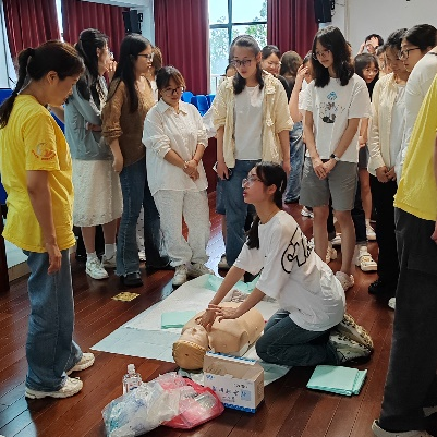 学前教育专业的同学们按耐不住激动的心情,把医生们团团围住,跃跃欲试,现场气氛热烈。在医生的指导下,有的体验海姆立克急救法,有的体验心肺复苏,有的体验绷带包扎,有的体验夹板固定,并就训练过程中的重点和难点与指导医生开展积极的互动。