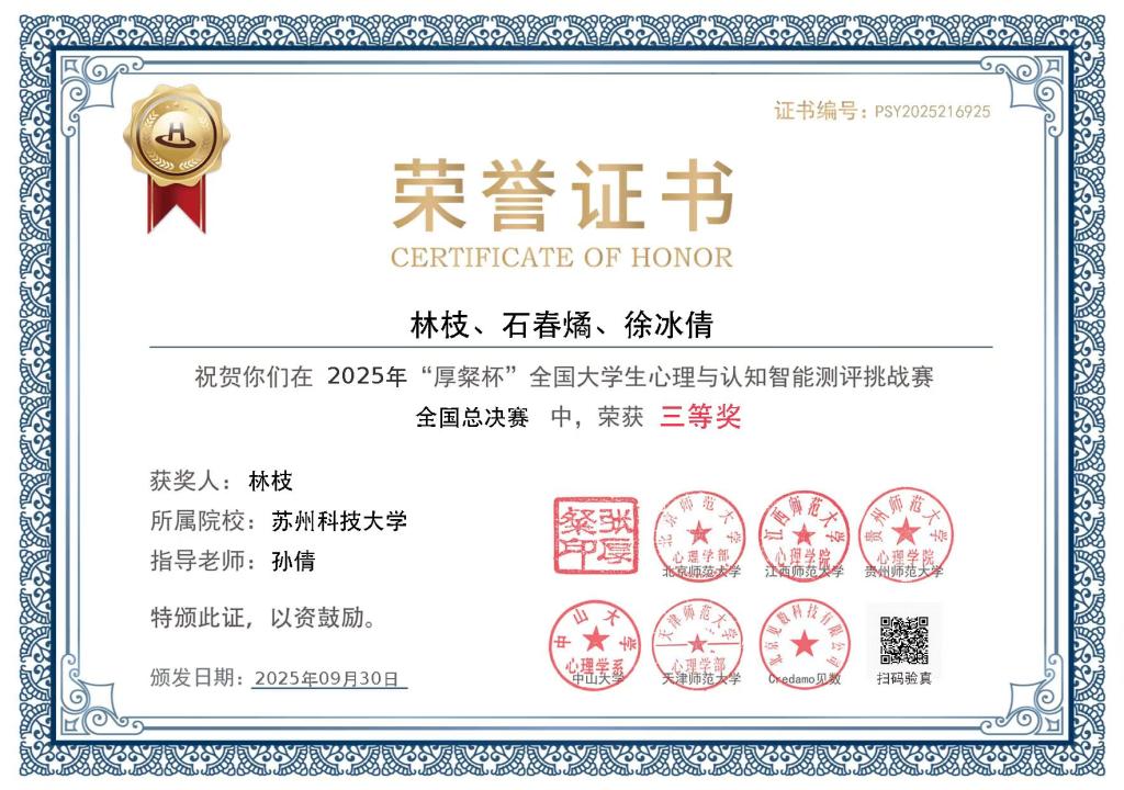 2025年9月27日,首届“厚粲杯”全国老员工心理与认知智能测评挑战赛在北京师范大学圆满收官。云顶国际8588yd应用心理学专业林枝、石春燏、徐冰倩三位同学的作品《老员工AIGC依赖量表的编制及信效度检验》摘得全国总决赛三等奖。