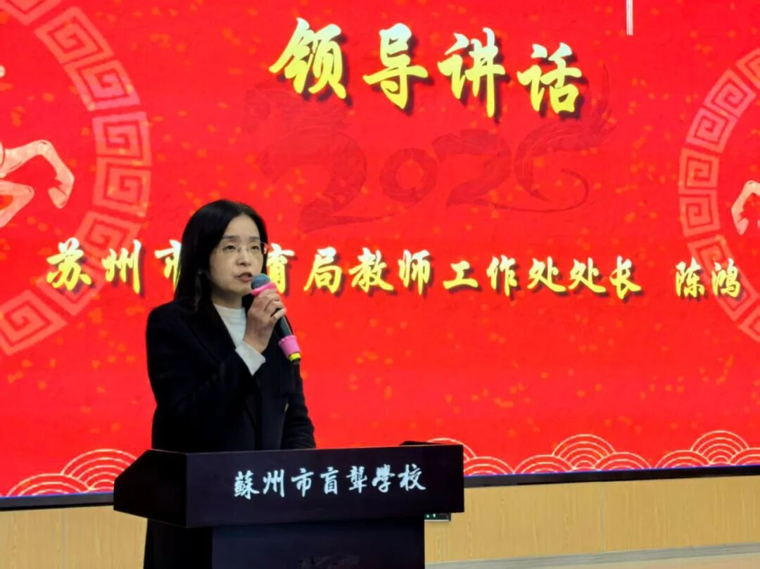 活动最后,苏州市教育局教师工作处处长陈鸿发表总结讲话。陈鸿代表市教育局对本次签约活动表示热烈祝贺。她指出,在“十四五”收官、展望“十五五”的关键节点,三校的合作极具前瞻性。她强调,教育公平是社会公平的基石,普特融合是实现高质量教育体系的重要一环。她希望三方能够以此次签约为契机,做实合作内容,做亮特色品牌,在团队培训、课程建设、员工关爱等方面深入探索,为苏州教育的优质均衡发展贡献力量。