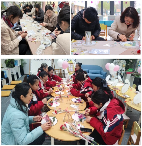 创意手作环节中,教职工们分组参与不同项目的体验:香皂手作区,大家制作仿真花造型手工香皂,感受手工创作的乐趣;宋锦挂饰区,体验非遗宋锦的工艺之美,传承传统文化;蔬菜花束区,将新鲜蔬菜与鲜花创意搭配,制作独具特色的“春日蔬菜花束”;团扇制作区,用干花、永生花装点空白团扇,定格春日美好。指尖流转间,高校教师与幼教一线工作者交流互动,现场气氛温馨融洽。随后开展的趣味团建将活动推向高潮。“圈里圈外”考验反应速度,“勾肩搭背”挑战团队默契,呐喊声与欢笑声交织,充分展现了女性教职工团结协作、昂扬向上的精神风貌。