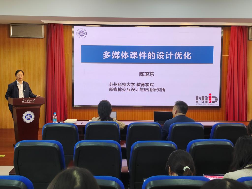 此次工作坊的主题为《多媒体课件的设计优化》。陈卫东介绍了多媒体课件设计的基本原理,优秀课件设计的基本特征,并以“秒出PPT”和“百度文档助手”平台为例,介绍了如何利用AI工具高效实现高质量课件的设计与制作。