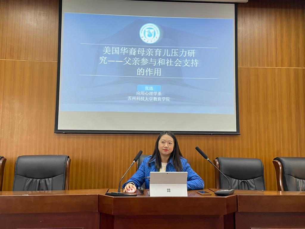张迅老师在介绍了育儿压力的背景和主要研究旨趣后,分析了美国华裔母亲的特殊性,以及父亲参与和社会支持对母亲育儿压力的影响。随后,张老师详细介绍了研究方案的设计、研究数据的收集、结果与结论,以及对当代中国家庭教育的启示和建议。